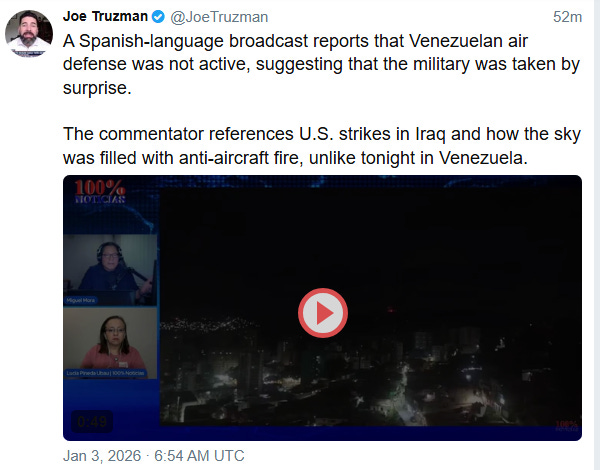 In addition to the lack of air defense, some of the videos on X and probably soon on the MSM show what look to me (reminder I am not a Military Analyst, nor do I play one on the Internet) like secondaries which tells me that there won’t be much if any air defense going forward either. So almost certainly the US has achieved air superiority which means that it can do whatever it wants with relative impunity. It has also, apparently, hit the airfield where the Maduro regime had their bug out planes, so they won’t be leaving.