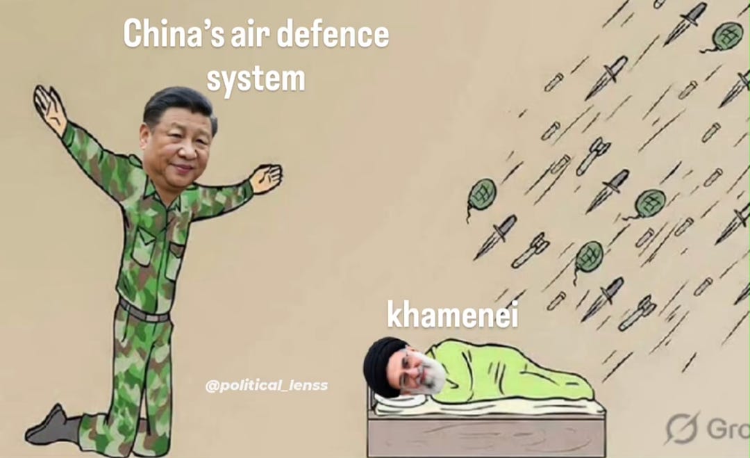 And that’s a problem. Russia doesn’t have any spare capacity, it’s committed to invading Ukraine and is completely bogged down there. Russia can send thoughts and prayers, but apart from possibly drones, it cannot send any hardware and, as we have now seen repeatedly, Russian Air Defense systems are not good against Israeli or US air attacks. Allegedly Russia and/or Belarus sent a few thousand enforcer troops to help the Basij and IRGC shoot Iranian protestors, but those enforcers are not able to defend against bombs and air attacks and, in fact, may well be some of the casualties from those attacks, along with their new buddies in the IRGC and Basij.