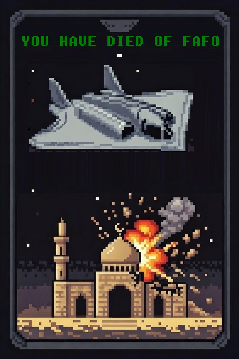They’re trying to shift the battlefield from the actual battle to the battle of ideas online. (It doesn’t help that many of their influential boosters are morons and/or frauds, from Candace to Scott Ritter.) This is why they tried—and are still trying—to flood the zone with obvious lies. It’s why they’re desperate to kill US servicemen. Their only hope is to frag US public support faster than their missile stockpile runs out. Read their spokesmen, like Marandi, and it’s all Epstein-conspiracy garbage—because it’s their only chance.