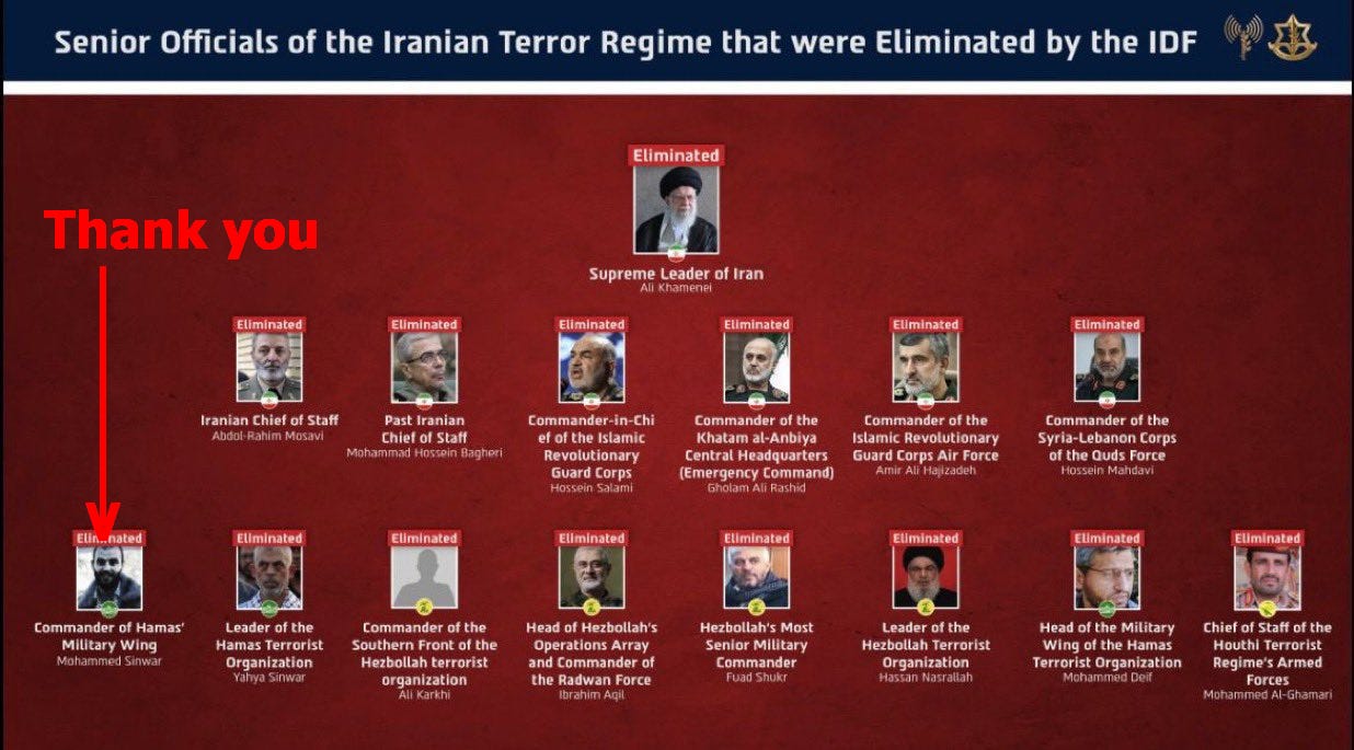 However, if it weren’t for Sinwar, I suspect none of this would have happened, so in a twisted way we can thank him for causing the downfall of his own terrorist organization, his allies and his sponsors. Well Done! Rot in hell!