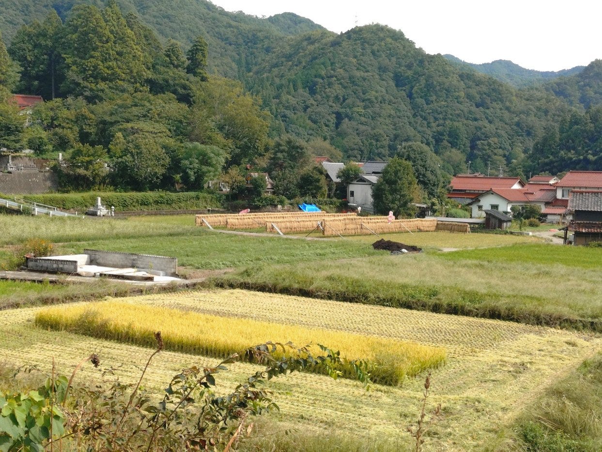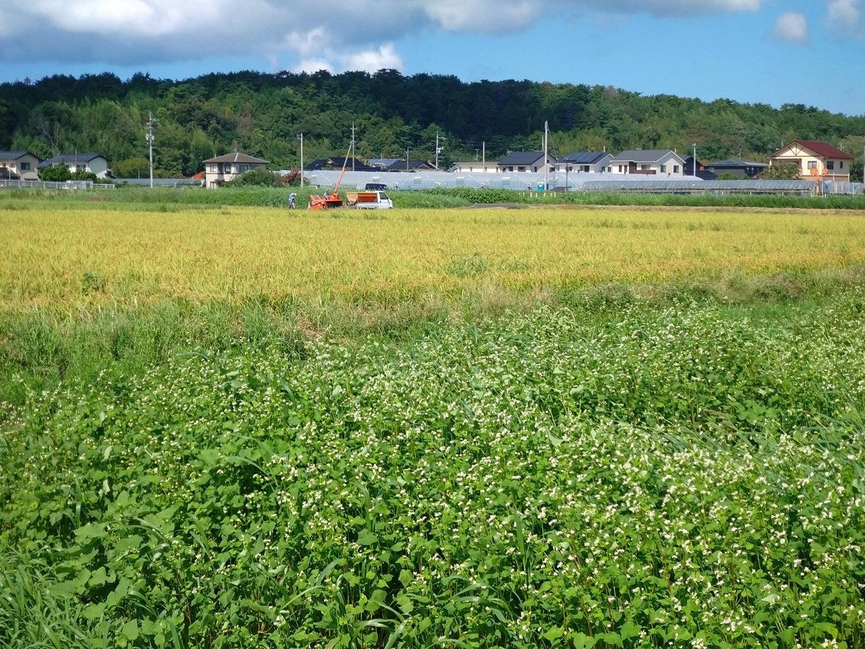 Also (as the picture above shows) you get the oddness of seeing the rice being harvested as the soba grows. That’s not quite as weird as May when they harvest the winter wheat/barley and plant the early rice at the same time, but it seems odd to me coming from a place where can only get one crop a year.