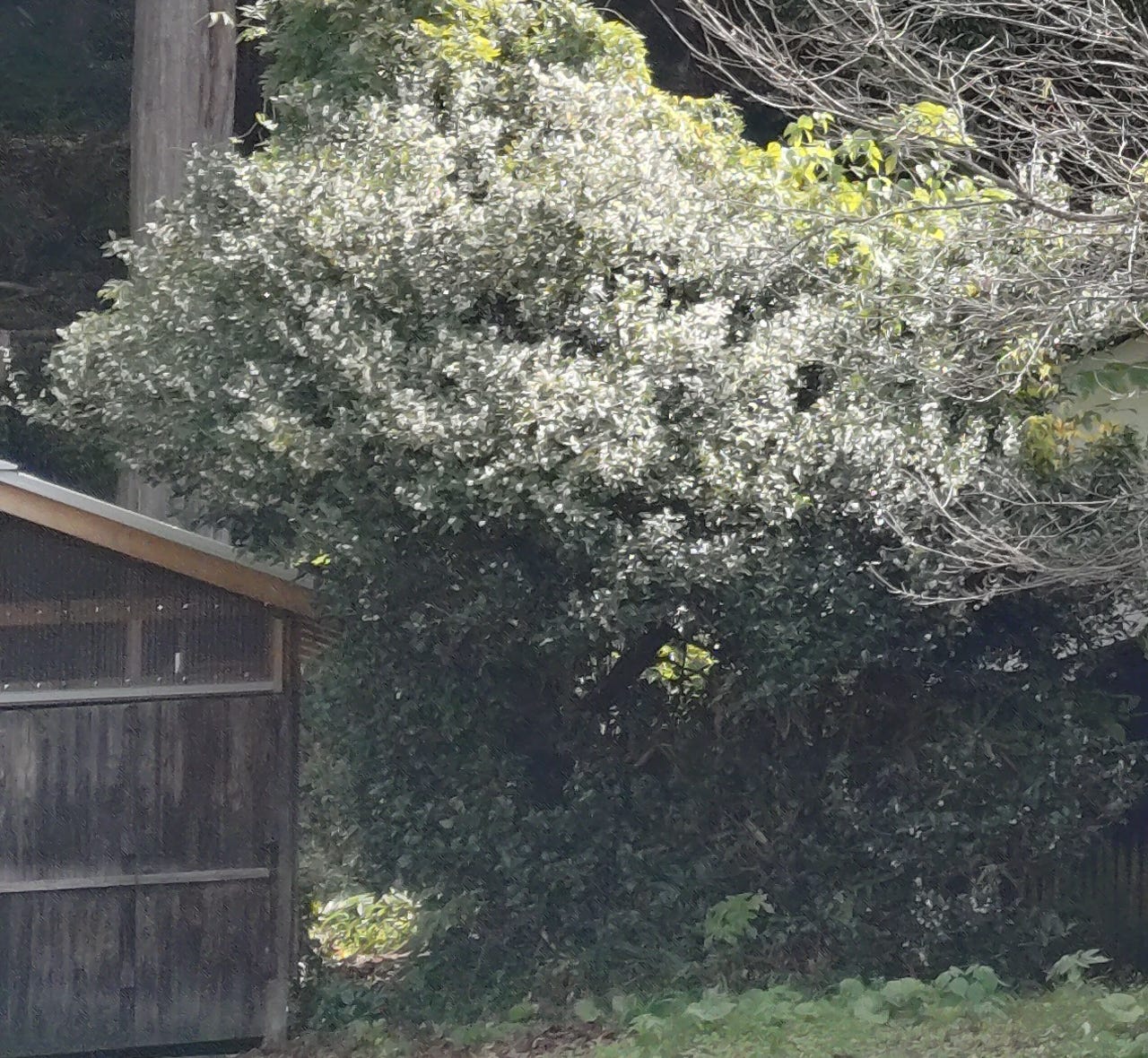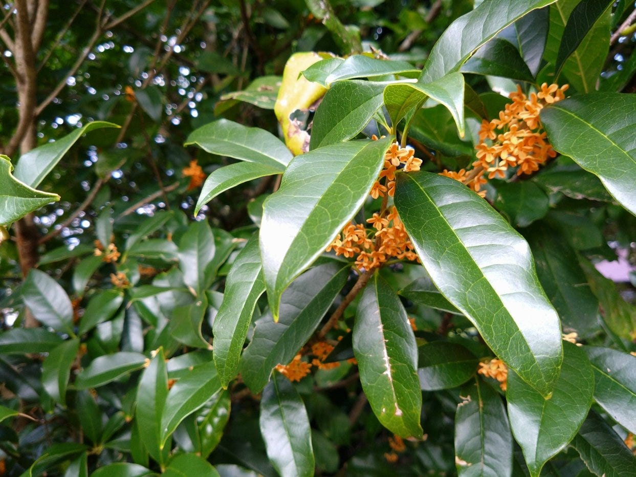More rare are the closely related Ginmokusei -銀木犀 - with white flowers, rather than yellow. We encountered one of those today as a decent sized tree
