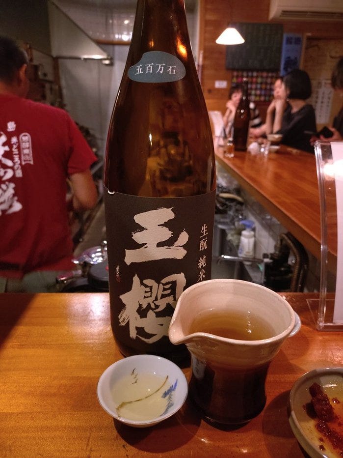 Not all sakes are good warmed but some sake houses here in Western Japan specialize in the types of sake that are good. Generally speaking this means sake made using the kimoto (生酛) method. A lot of sake is like white wine and expected to be drunk fairly soon after it has been brewed but kimoto sakes age well (more like red wines) and many get a brown tinge as they do so making them resemble whiskey. They don’t taste like either red wine or whiskey but if you appreciate the nose aspects of your single malt scotch or premier cru bordeaux then you’ll get a similar enjoyment from inhaling the scents of heated kimoto sakes